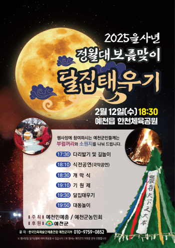 예천군 2025 을사년 정월대보름 달집태우기 행사가 오는 12일 오후 5시 30분 예천읍 한천체육공원에서 열린다.