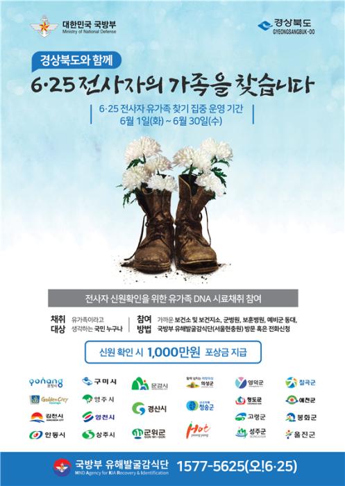 (경북도=경북온뉴스) 김광열 기자 = 경상북도는 국방부 유해발굴감식단(단장 허욱구), 22개 시군(울릉군, 포항시 남구 제외)과 합동으로 호국보훈의 달인 6월 한 달 동안 6‧25전사자 유가족 DNA 시료를 집중적으로 채취한다.