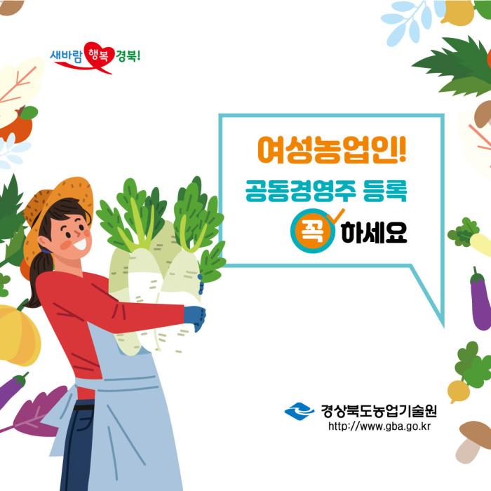 신용습 경상북도농업기술원장은 “공동경영주 등록 확산 캠페인을 추진해 등록율 향상을 위한 홍보 활동을 더욱 강화하겠다”라며 “생활개선회와 4-H회 및 품목단체를 중심으로 우선적으로 등록하여 여성농업인이 당당히 농업인으로 직업적 지위를 인정받을 수 있길 바란다”라고 전했다.
