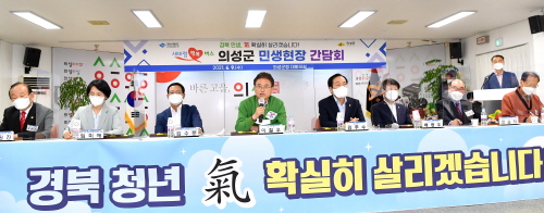 의성군 현장 간담회에서는 이철우 도지사를 비롯해 김주수 의성군수,지역의 청년 대표 및 기관‧사회단체장 등 40여명이 참석한 가운데 “경북 청년 기(氣) 확실히 살리자”라는 주제로 열띤 토론을 펼쳤다.