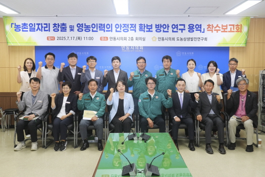 안동시의회 도농상생발전연구회(회장 김창현)가 17일 의회 회의실에서 소속 의원들과 담당 공무원 등 20여 명이 참석한 가운데 ‘농촌일자리 창출 및 영농인력의 안정적 확보 방안 연구'를 위한 용역 착수보고회를 개최했다.