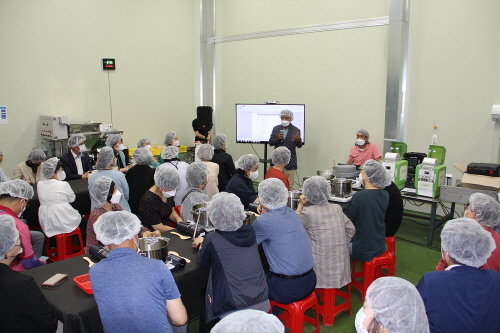 (안동=경북온뉴스) 김승진 기자 = 경북도민행복대학 안동캠퍼스 13차시 강의가 지난 8일 오후 안동시 남선면 ㈜니껴바이오(대표 김영배) 낫또 공장에서 열렸다. 이번 강의는 낫또 제조시설 견학과 순두부 만들기, 미생물 배양체험, 그리고 콩나물 키우기 키트체험 등으로 진행됐다.