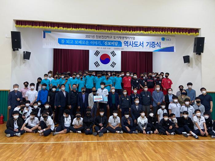 (청송군=경북온뉴스) 임성철 기자 = 청송군 진보진안지구 도시재생주민협의체(위원장 권동준)가 지난 4일 진성중학교 강당에서 '참되고 보배로운 이야기! 진보미담(眞寶美談)' 역사도서 기증행사를 가졌다.