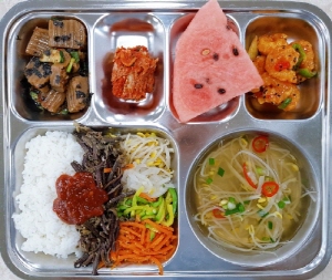 채식주의 8단계 유형중 ‘페스코 베지테리언’으로 육류·가금류만 제한하는 식단으로 채식비빔밥, 맑은콩나물국, 도토리묵무침, 깐쇼새우, 수박, 배추김치로 구성하였으며 또한, 채식비빔밥에 육류를 제한하고 각종 버섯으로 조리하여 고추장볶음을 비빕밥 소스로 급식을 제공했다.