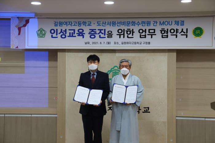 (안동=경북온뉴스) 김광열 기자 = 길원여자고등학교(교장 강중호)와 도산서원선비문화수련원(원장 김종길)은 6월 7일 인성교육 활성화를 위한 업무협약(MOU)을 체결했다.
