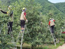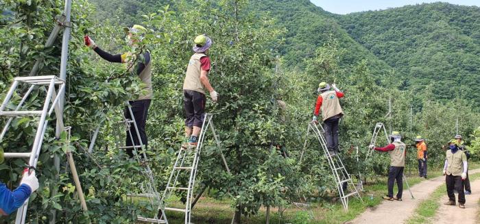 주왕산국립공원 직원 및 포스코 야간열차 봉사단 30명은 지난 9일 청송군 주왕산면 부일리에 위치한 과수농가를 방문해 사과 적과에 구슬땀을 흘렸다.
