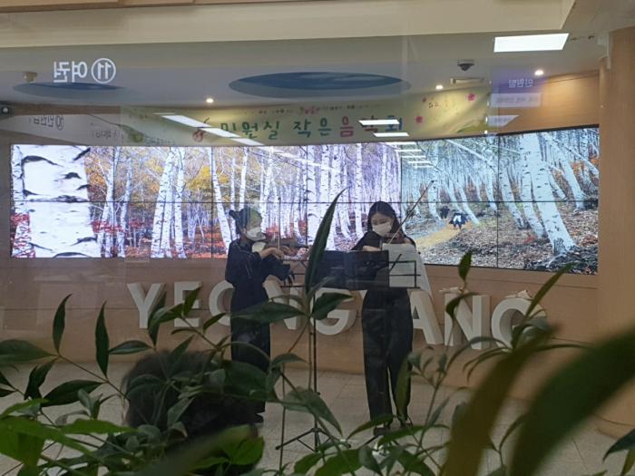 이날 공연은 군이 코로나19로 힘들고 우울감을 느끼는 군민들과 직원들을 위해 기획한 것으로 지역 음악가 박춘선씨와 그의 제자 김가영씨의 재능기부로 진행되었다. 두 사람은 바이올린 이중주로 인기드라마 주제곡‘인생의 회전목마’외 4곡을 연주 후 트롯곡인‘아모르파티’로 청중들의 흥을 돋웠다.