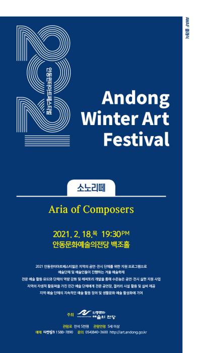 (안동시=경북온뉴스) 우미영 기자 = 안동문화예술의전당은 ‘2021안동윈터아트페스티벌AWAF(Andong Winter Art Festival)’의 두 번째 공연 ‘소노리떼 – Aria of Composers’를 오는 18일 오후 7시 30분 백조홀에서 개최한다.