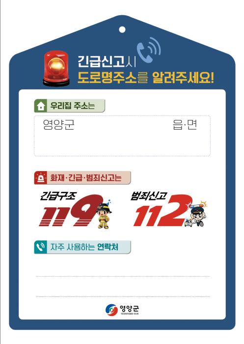 (영양군=경북온뉴스) 임성철 기자 = 영양군은 사회적 약자를 위한 ‘긴급상황 신고용 도로명주소 스티커’를 제작·배부한다.