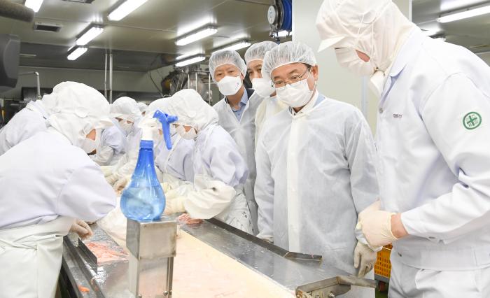 이철우 도지사는 간담회를 마친 후 영덕군 강구면에 위치한 ‘대호수산(주)’를 방문하여 영덕의 대표 수산물인 대게를 활용한 농축게장, 대게살 등의 제조 공정을 살펴본 후 수산물가공 제품을 일본에 수출하는 등 지역경제 활성화에 기여하고 있는 임직원들을 격려하고 애로사항을 청취했다.