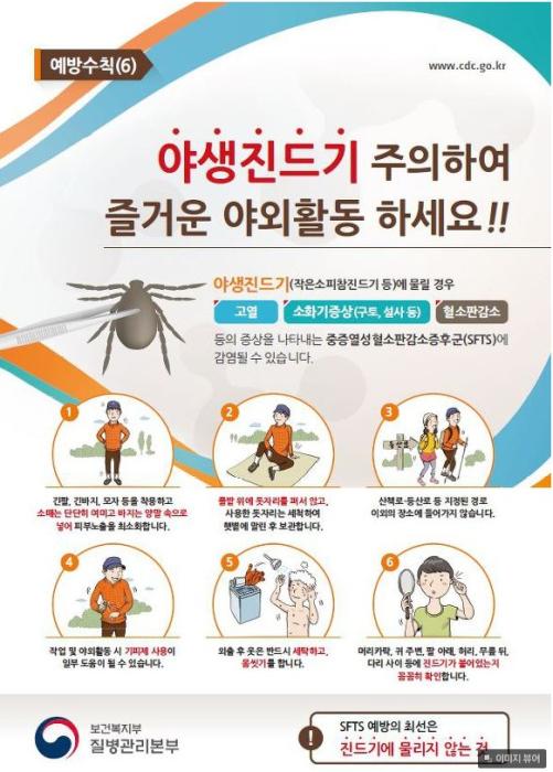 보건소 감염병대응과장은 “SFTS는 치료제와 예방백신이 없는 치사율이 높은 감염병으로 등산, 레저 등 야외활동 시 진드기에 노출되지 않도록 각별히 주의해야한다”며“진드기에 물렸다면 바로 손으로 떼어내지 말고 가까운 의료기관에 방문하여 진료를 받아야 한다.”고 했다.