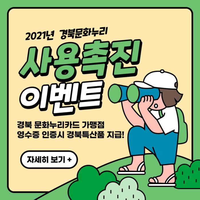 (경북도=경북온뉴스) 김승진 기자 = 경상북도는 여름휴가철 경북 방문객 유입 촉진 및 문화누리카드 가맹점 매출증대를 위해 경북도내 문화누리카드 오프라인 가맹점 이용자를 대상으로 ‘2021년 문화누리카드 사용촉진 이벤트’를 시행한다. 이벤트 결과는 9월 3일 경북문화재단 홈페이지에서 확인가능하며, 당첨자에게는 개별 문자로도 전송된다.