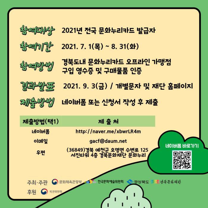 이벤트 참여 신청은 네이버폼을 작성·제출하거나 경북문화재단 홈페이지에서 신청서 양식을 내려받아 작성한 후 담당자 이메일(gacf@daum.net) 또는 우편(경북 예천군 호명면 수변로 125 서진타워 4층 경북문화재단 문화누리)으로 제출하면 된다.