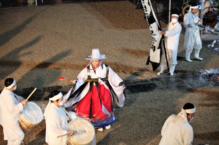 (안동제비원성주굿=경북온뉴스) 김승진 기자 = 제12회 '안동제비원성주굿 상설 공개시연'이 열린 지난 밤(7.3.토) 안동웅부공원 특설무대는 수 천년 역사의 맥을 잇겠다는 열정과 혼신을 다하는 사)안동제비원성주풀이보존회와 그 전수생들의 격정적인 공연이 펼쳐져 공연을 응원하러 참석한 내빈들과 관람객들로 부터 뜨거운 박수와 격려가 쏟아졌다.