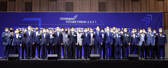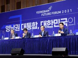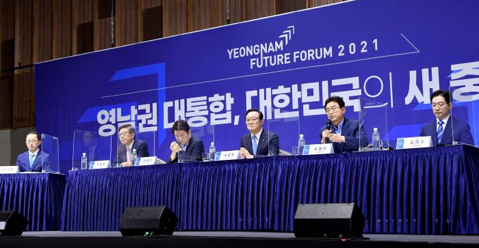영남권 대통합, 대한민국의 새 중심으로!’란 주제로 개최된 ‘2021 영남미래포럼은 김사열 대통령소속국가균형발전위원장을 좌장으로 영남권 5개 시도지사들이 지역의 현안에 대한 정책방향을 제시했다.