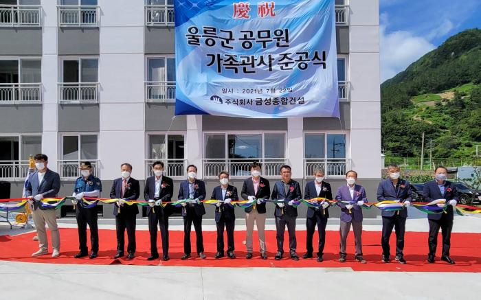 ‘울릉군 공무원가족관사’는 지난 2019년부터 2020년까지 총 사업비 30억4천6백만 원을 확보하여 서면 우산국박물관 맞은편 부지에 터를 닦고 2020년 6월부터 2021년 6월까지 1년간 건축공사를 시행하여 연립주택 지상 4층 규모에 연면적 975.4㎡, 전용면적 58㎡로 총 12세대가 거주할 수 있는 주거공간을 마련했다.