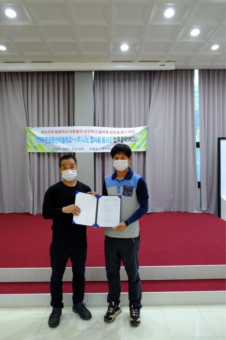 (상주시=경북온뉴스) 김광열 기자 = 청명푸른꿈동산 마을학교는 지난 21일(수) 오후 5시 지역 돌봄 취약계층 아동들의 체계적인 후원을 위해 ㈜나노 참사랑봉사단과 업무협약을 체결했다.