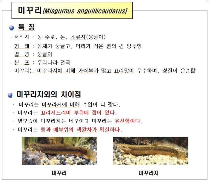 - 미꾸리 2만원/kg, 미꾸라지 15천원/kg, 중국산 미꾸라지 1만원/kg