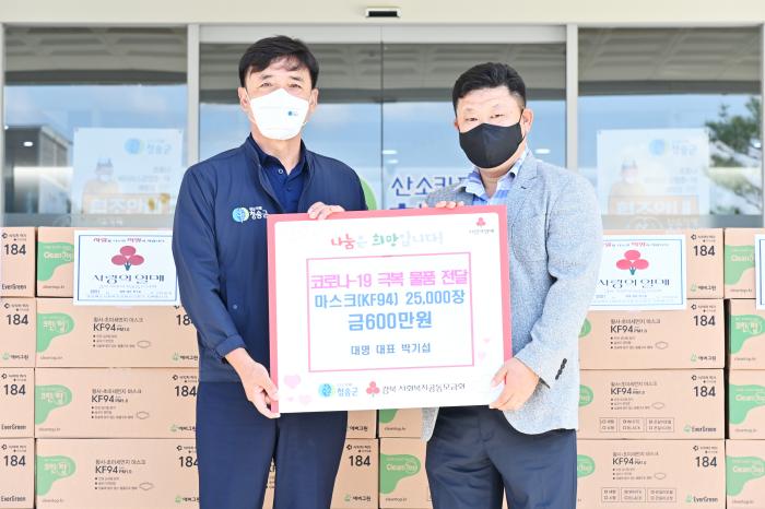 (청송군=경북온뉴스) 임성철 기자 = 청송군은 대명 박기섭 대표가 27일 청송군을 방문해 코로나19 극복을 위한 마스크(KF94) 25,000장을 기부했다.