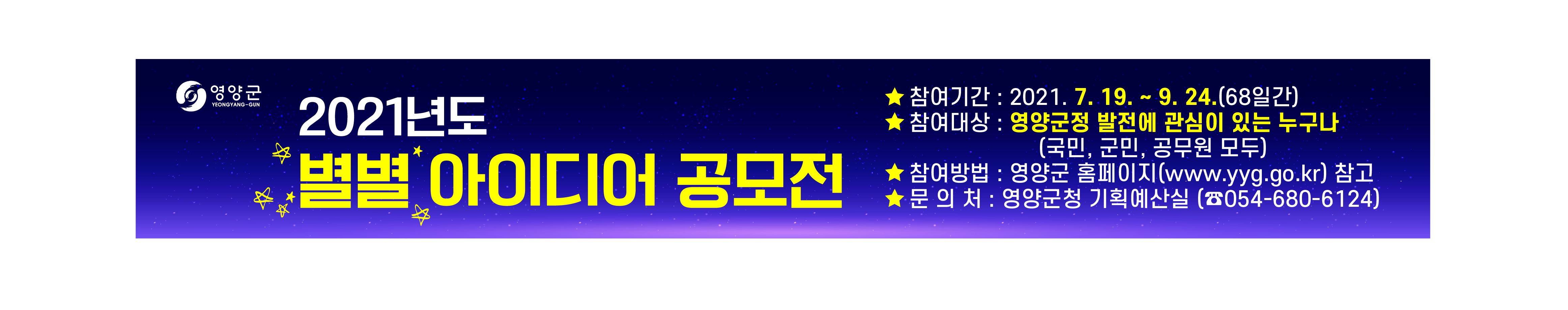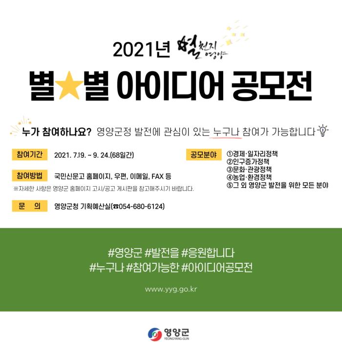 경북 영양군은 창의적 아이디어를 발굴하고 군정 혁신의 기반을 마련하고자 9월 24일까지 '2021년 「별천지 영양, 별☆별 아이디어」 공모전'을 통해 제안을 접수하고 있고 9일 밝혔다.