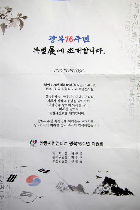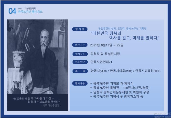 안동시민연대21은 코로나19 위기극복을 통하여, 대한민국이 내일로 도약하는 위대한 도전의 문 앞에선 오늘, 올바른 광복의 역사를 통해 국민 모두가 미래를 향한 큰 걸음을 내딛고자 “임청각! 76주년 광복절 특별사진전”을 펼친다.
