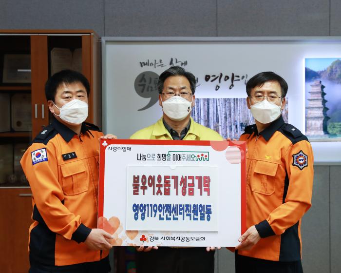 오도창 영양군지역사회보장협의체공공대표위원장은 “이웃사랑 실천에 앞선 영양119안전센터 직원들에게 감사드리며, 함께모아 행복금고사업을 통해 모여진 기부금으로 관내 소외된 이웃들이 어려움을 딛고 일어설 수 있도록 사랑은 나누고 행복은 더하는 영양군지역사회보장협의체가 되도록 노력하겠다.”고 말했다.
