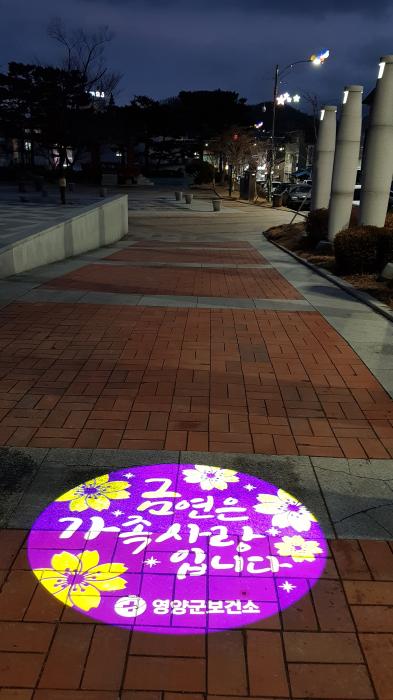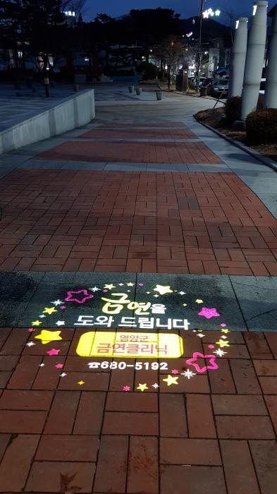 설치 장소는 군민들이 자주 이용하는 공설운동장과 군청 앞 솔광장이며 이번 홍보의 목적은 어두운 밤거리를 밝혀주는 것뿐만 아니라 ‘금연은 가족 사랑입니다.’와 ‘영양군 금연클리닉, 금연을 도와드립니다.’라는 문구를 거리에 비추어 지역사회 금연 분위기를 조성하고 흡연자의 금연클리닉 이용을 홍보하기 위함이다.