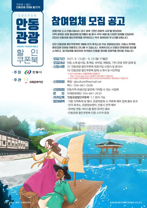 안동시는 코로나19로 인한 지역 내 불황을 이겨내고 안동 관광활성화를 위해 ‘안동관광 할인쿠폰북’에 참여할 업체를 오는 23일까지 모집한다.