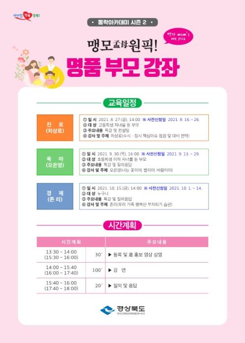 경상북도는 도청 동락관에서 8월부터 10월까지 세 차례*에 걸쳐 진로ㆍ육아ㆍ경제 분야 명사를 초청해‘맹모(孟母) 원픽! 명품 부모강좌(이하 강좌)’를 개최한다고 23일 밝혔다.