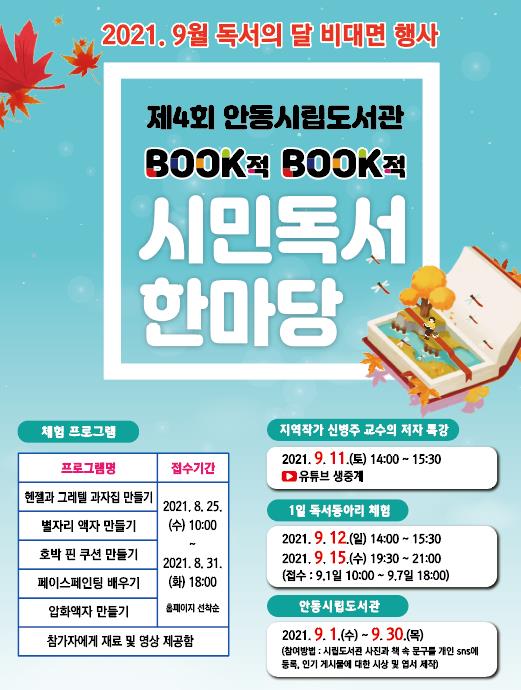 안동시립도서관은 2021년 ‘9월 독서의 달’을 맞아 코로나19의 유행 장기화로 지친 시민들이 집에서 편안하고 안전하게 독서문화 생활을 즐길 수 있도록『제4회 BOOK적 BOOK적 시민독서한마당』을 비대면으로 개최한다.