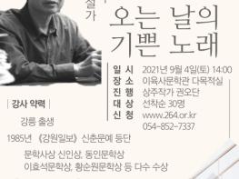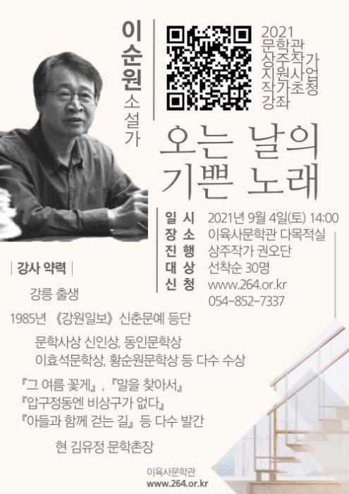 이육사문학관에서는 오는 9월 4일(토) 오후 2시, (사)이육사추모사업회가 주최하고, 이육사문학관이 주관하며, 국민체육진흥공단, 문화체육관광부, (사)한국문학관협회가 후원하는 상주작가 지원사업 “오는 날의 기쁜 노래 - 작가와의 만남” 그 세 번째 이야기를 진행한다.
