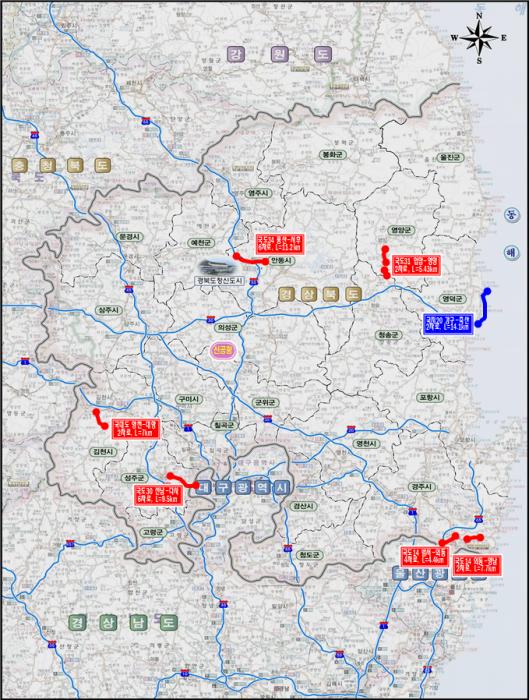 ③ (시설개량사업) ▷영양 입암~영양간 국도31호선 2차로 개량 5.43km 총사업비 920억 원 ▷영덕 강구~축산간 국지도20호선 2차로 개량 14.13km 총사업비 1101억 원 ▷경주 외동~양남간 국도14호선 2차로 개량 7.73km 총사업비 669억 원