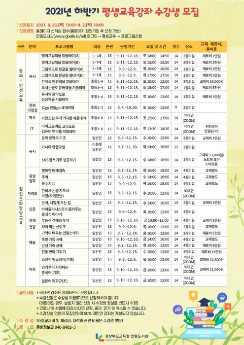 경상북도교육청 안동도서관(관장 마원숙)은 8월 26일부터 학생·학부모 및 지역주민을 대상으로 하반기 평생교육강좌 수강생을 모집한다.