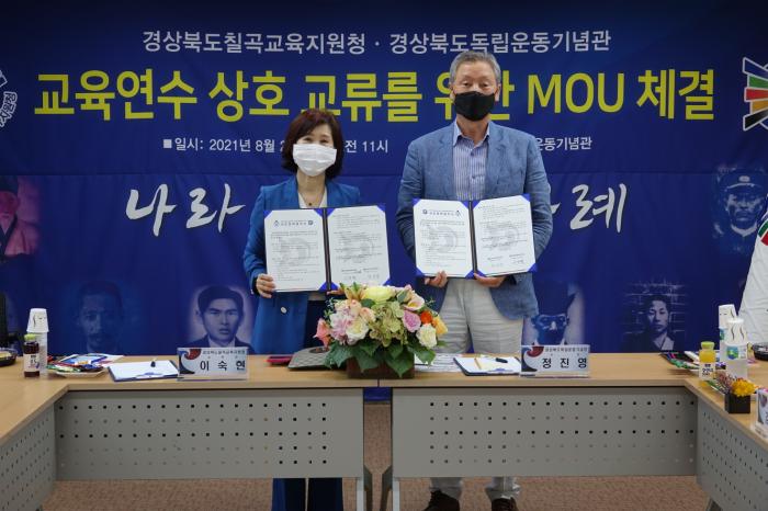 경상북도독립운동기념관(관장 정진영)과 경상북도칠곡교육지원청(교육장 이숙현)은 칠곡지역 학생들에게 경북의 독립 운동사를 바르게 알리고 자긍심을 높여 주기 위한 교육 연수 활성화 업무협약을 2021. 8. 20.(금) 체결했다.