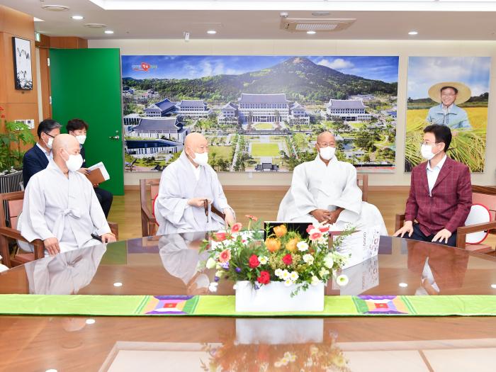 이철우 도지사는 불교계 큰 어르신인 종정 진제 대종사의 도청 방문에 감사의 뜻을 전하며 코로나19로 유래 없는 어려움을 겪는 도민들에게 위로와 지혜의 말씀을 청했다.