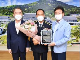이철우 경상북도지사는 7일 오전 도청에서 포항 형산강 섬안큰다리 인근에서 극단적 선택을 시도한 30대 남성을 구한 포항남부경찰서 상대지구대 김현필 경위(56세)에게 표창패를 수여했다.