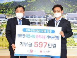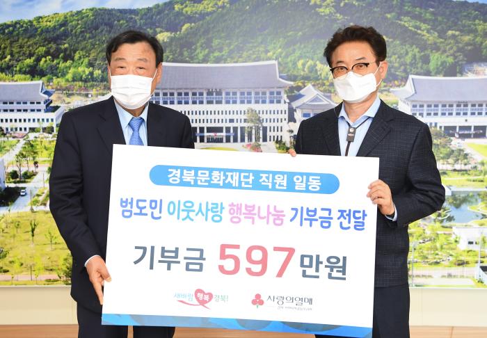 (경북도=경북온뉴스) 김승진 기자 = 경북문화재단(대표이사 이희범)은 22일 코로나19로 어려움에 처한 소상공인 등 이웃사랑 실천을 위해 경북도와 경북사회복지공동모금회에서 추진하는 범도민 이웃사랑 행복나눔 캠페인에 동참하여 성금 597만원을 전달했다.