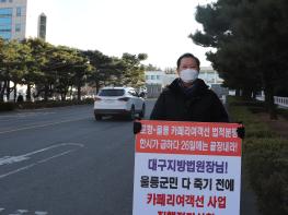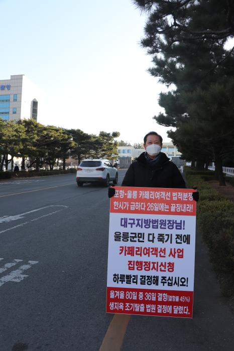 (경북도의회=경북온뉴스) 김승진 기자 = 남진복 경북도의원(울릉 출신)은 23일 대구지방법원 앞에서 울릉도 카페리여객사업 집행정지신청에 대한 법원의 빠른 결정을 호소하며 1인 시위에 나섰다.