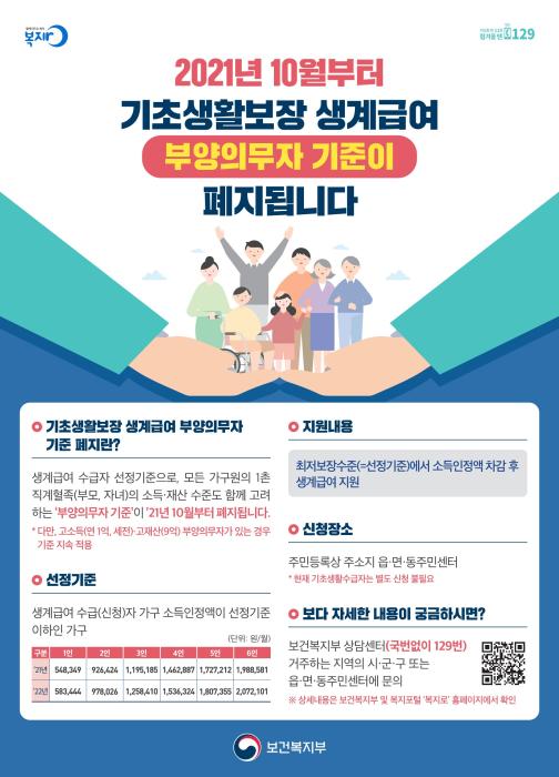 다음 달부터는 생계급여 신청자가 부양의무자 기준을 적용받지 않고 수급가구의 소득․재산에 대한 지원기준만 충족하면 기초생활 생계급여를 지원받을 수 있게 된다.