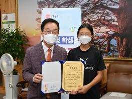 이번 선행의 주인공은 울진 부구초 5학년 강나현 학생으로 지난 7월 31일 울진 불영계곡에서 물놀이를 하던 중 깊은 계곡 물에 빠져 허우적거리는 두 아이(9살, 7살)를 발견하고 얕은 곳으로 빠져 나올 수 있도록 도와주었다.