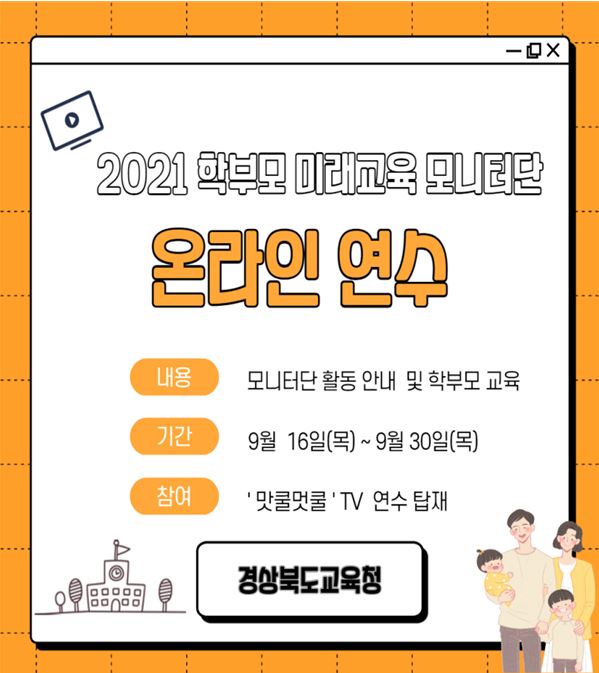 경북교육청(교육감 임종식)은 16∼30일까지 학부모 미래교육 모니터단을 대상으로 유튜브 ‘맛쿨멋쿨 TV’를 이용해 온라인 연수를 한다.