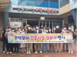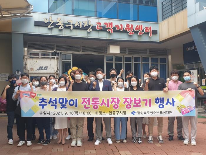 경상북도청소년육성재단(대표이사 김치영)은 16일(목) 추석 명절을 앞두고 코로나19 장기화로 인한 경기침체와 위축된 소비심리 감소 등으로 어려움을 겪고 있는 안동구시장을 방문하여 미리 준비한 온누리상품권을 사용하여 지역특산품, 제수용품, 성수품 등을 구입하며 전통시장 활성화에 동참했다.