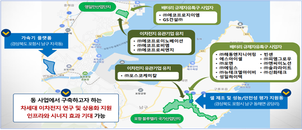 포항의 배터리 특구는 2019년 7월 지정 이후 GS건설의 투자를 시작으로 에코프로, 포스코케미칼 등 대규모 기업투자가 줄 이으며 ‘배터리 핵심소재 - 배터리 완제품 - 배터리 재활용·재사용 – 전기차’의 전주기 배터리 산업 생태계가 구축된 가장 성공적인 규제자유특구 모델로 손꼽히고 있다.