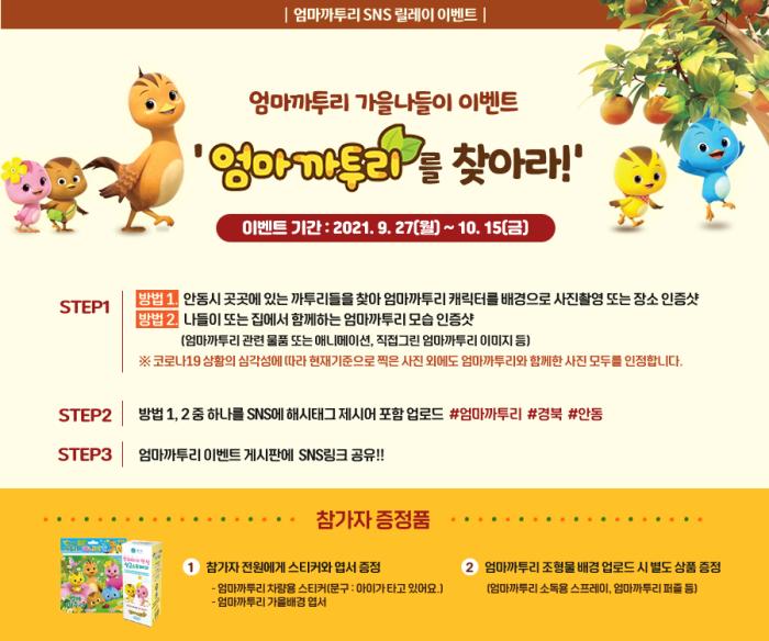 이번 이벤트는 엄마까투리 홈페이지(www.katuri.co.kr)를 통해 9월 27일(월)부터 10월 15일(금)까지 약 3주간 진행되며, 안동시 내에 설치된 엄마 까투리 조형물, 벽화 등을 찾아 인증샷을 찍거나, 인형이나 애니메이션, 직접 그린 엄마까투리 이미지 등을 찍어 SNS에 #엄마까투리 #경북 #안동 등 해시태그와 함께 업로드한 후 엄마까투리 홈페이지에 링크를 공유하면 참여가 완료된다.