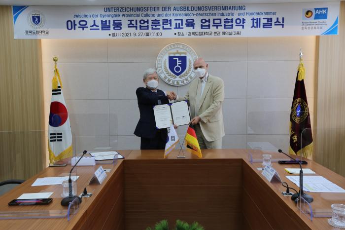 경북도립대학교는 27일 오전 대학본부에서 김상동 총장과 스테판 스프로이 한독상공회의소 부회장 등이 참석한 가운데 ‘아우스빌둥 직업훈련교육 업무협약’을 체결했다.