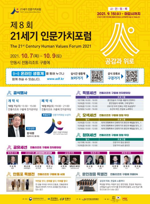 금년도 포럼의 세부내용은 21세기 인문가치포럼 홈페이지(www.adf.kr)에서 확인할 수 있으며, 사전등록은 홈페이지를 통해 9월 16일(목) ~ 마감시까지 진행되며, 사회적 거리두기 여파로 현장 참여가 축소된 점을 고려하여 사전등록을 미처 하지 못한 참가자들을 위해 포럼 홈페이지와 인문가치포럼 공식 유튜브 채널을 통해 실시간 생중계가 진행될 예정이다.