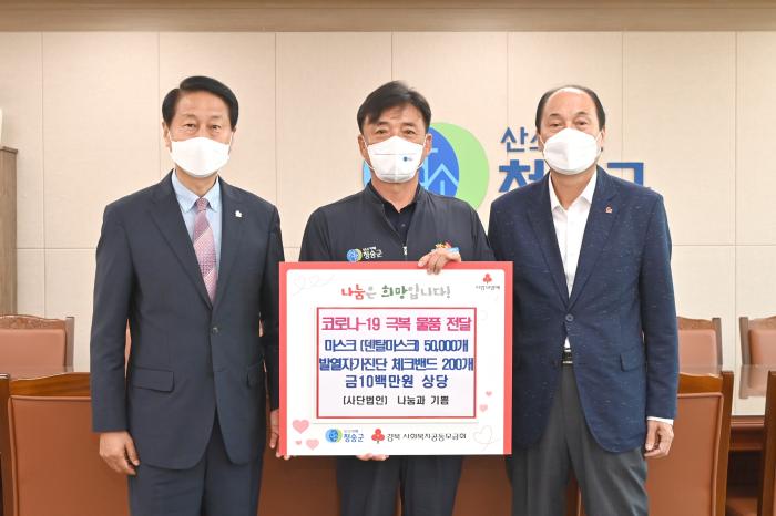경기도 광명시에 소재한 (사)나눔과기쁨(이사장 나영수 목사)에서 1일 청송군을 방문해 코로나19극복을 위한 마스크 50,000장과, 발열자가진단 체크밴드 200개를 기부했다.