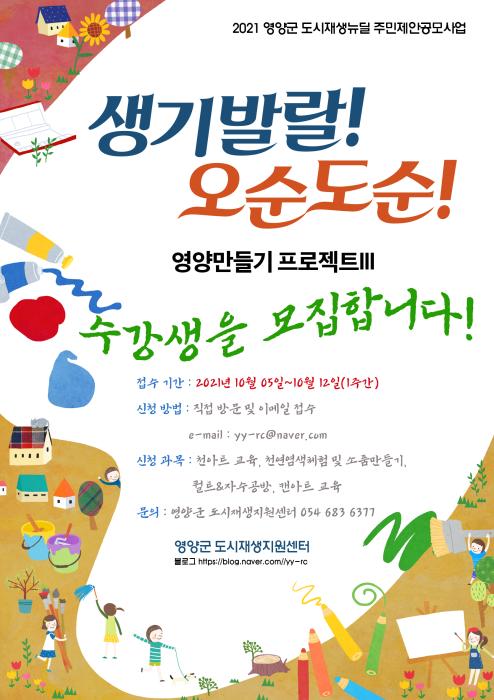 이외 일반공모에는 황용천길가꾸기Ⅲ, 도시재생영상기록Ⅲ 등 소규모 환경개선 및 공동체 활성화를 위한 사업이 선정됐다. 황용천길가꾸기사업은 영양고·영양여고 학생들이 참여해 황용천길 교각에 벽화그리기 작업을, 도시재생영상기록사업은 영양군 도시재생사업의 과정을 담은 영상을 만들 예정이다.