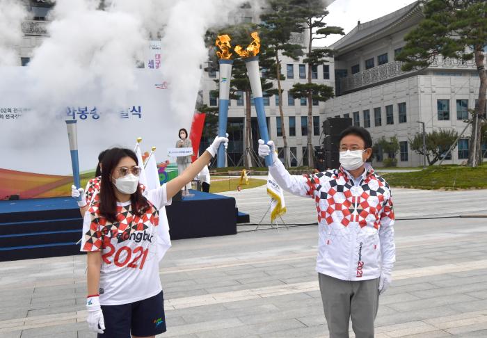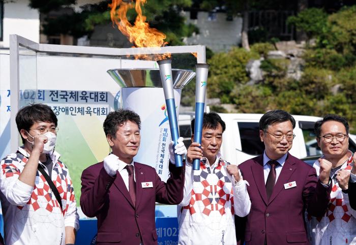 경상북도는 4일 도청에서 제102회 전국체육대회(이하 전국체전)와 제41회 전국장애인체육대회(이하 장애인체전) 성화 봉송 출발식을 개최했다.