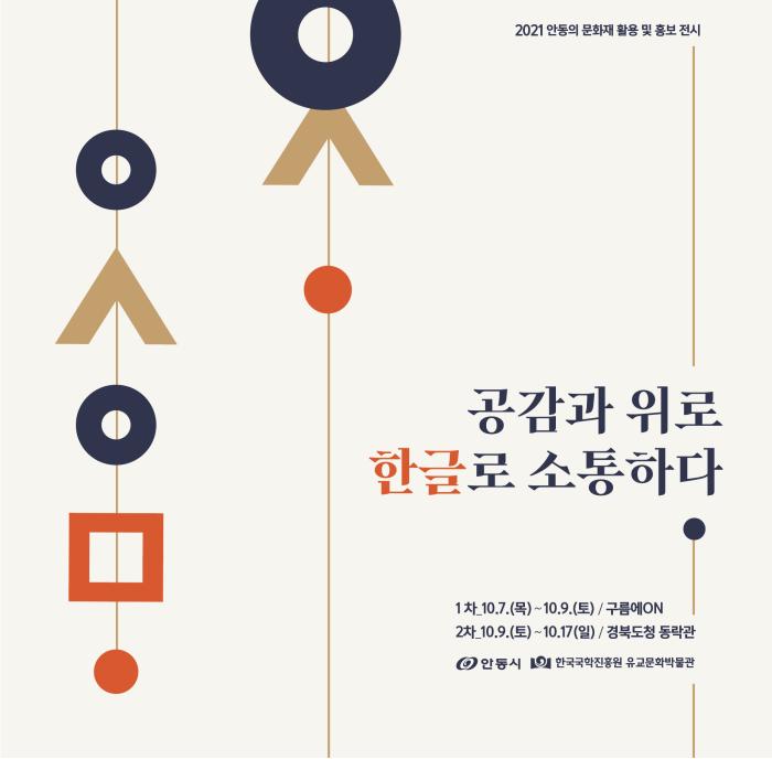 한국국학진흥원(원장 정종섭)은 10월을 맞이하여 2021 안동의 문화재 활용 및 홍보 전시 ‘공감과 위로, 한글로 소통하다’를 개최한다. 전시는 2곳에서 진행된다. 10월 7일부터 9일까지는 한국정신문화재단과 공동으로 ‘21세기 인문가치포럼’ 기간 동안 전통리조트 구름에 카페On에서 전시를 개최한다. 10월 9일부터 17일까지는 ‘한글 비전 선포식’이 열리는 경북도청 동락관 1층 기획전시실에서 전시를 만나볼 수 있다.